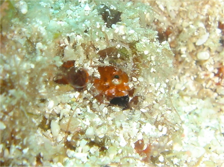撮影 2004/10/07 メキシコ ラパス 掲載 2007/03/11 ⇒コケギンポの仲間 かわいらしいギンポなのに名前は分からずじまいです。撮影した魚の同定のためにコルテス海の図鑑を2冊購入したのですが、どちらも掲載してある魚の種類が格段に少なくて結局分かりませんでした。日本の図鑑に慣れた身にはかなり不満が残ります。