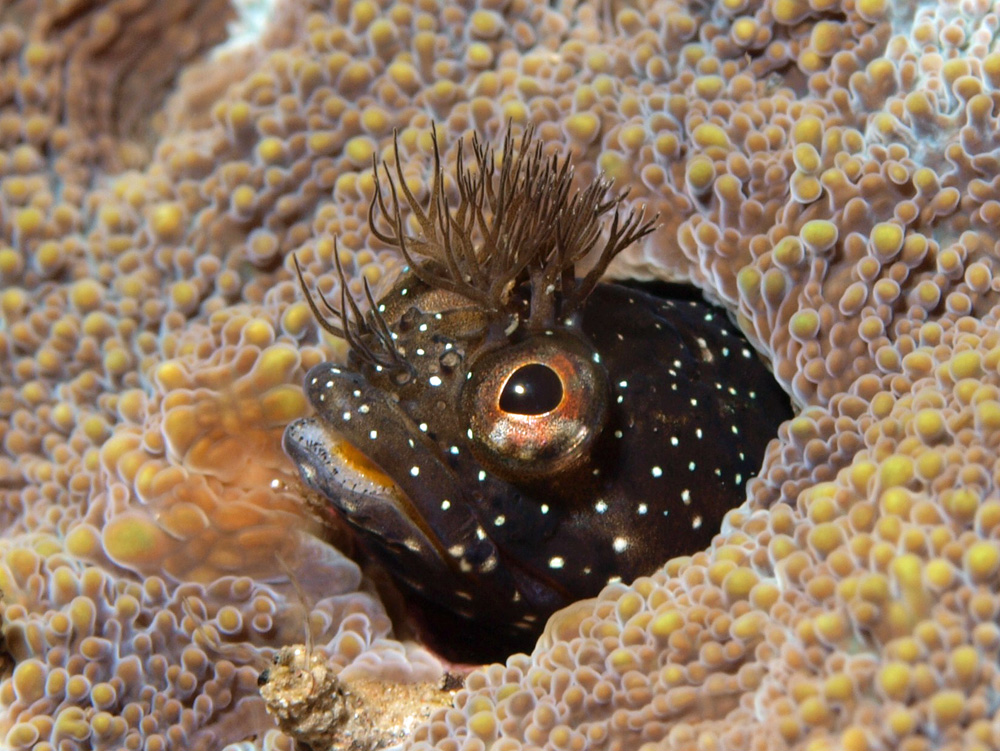 この種類は眼状皮弁が3本あって樹枝状に分岐します。その点ではコケギンポと同じですが、背鰭の第1棘と第2棘の間に黒点があるのが違い。