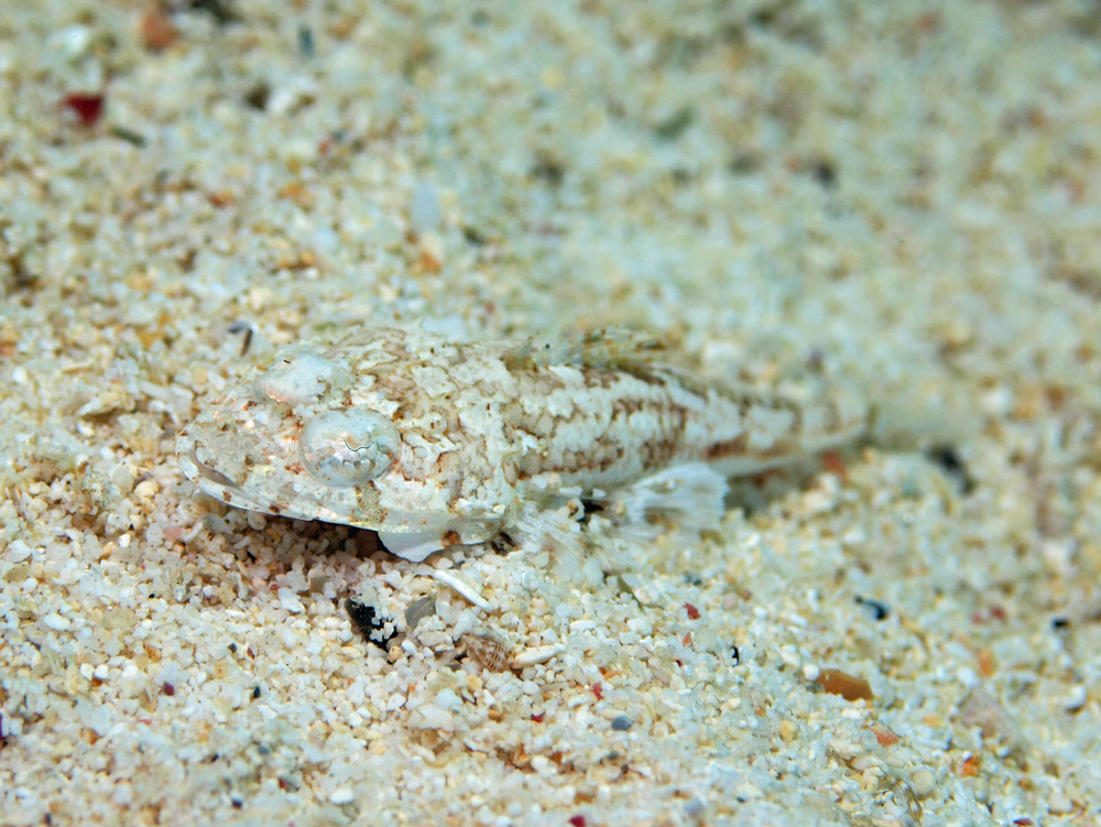 明るい海底に合わせて自分の体色を白っぽくしており、ほとんど眼を閉じているので虹彩皮膜の形が確認できないのですがクロシマゴチだと思います。