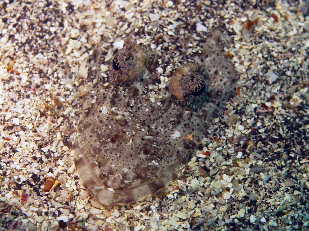 コチの仲間はそれぞれが似たような印象で見分けが難しい種類が多いのですが、セレベスゴチは眼の上から垂れるヒラヒラ(虹彩皮膜)が短く、かつ枝分かれしていることで他の種類と区別されるそうです。