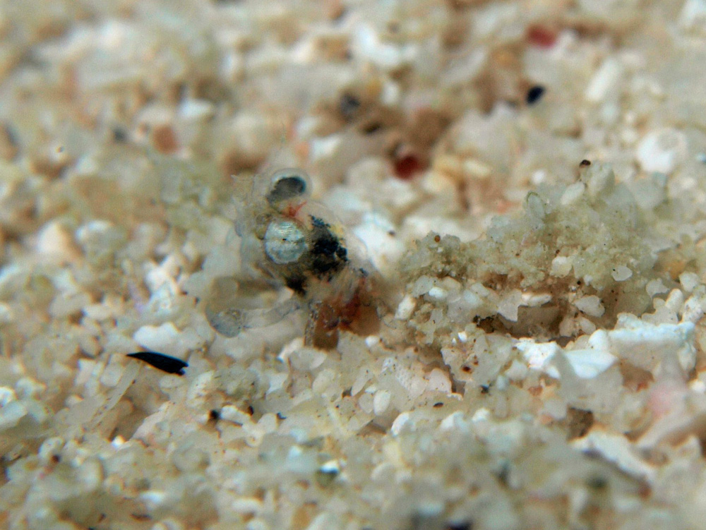 撮影 2008/09/01 沖縄県 竹富島 掲載 2013/03/08 ⇒甲殻類(その他)の仲間 下半身が砂の中に隠れてしまって見えません。 それにしても何者でしょう? 一見エビのようですが、眼の形もはさみ脚の形も違います。 甲殻類であることは確かだと思うんですがそれ以上はさっぱり分かりません。個性的な生き物だというのに残念ですねえ。