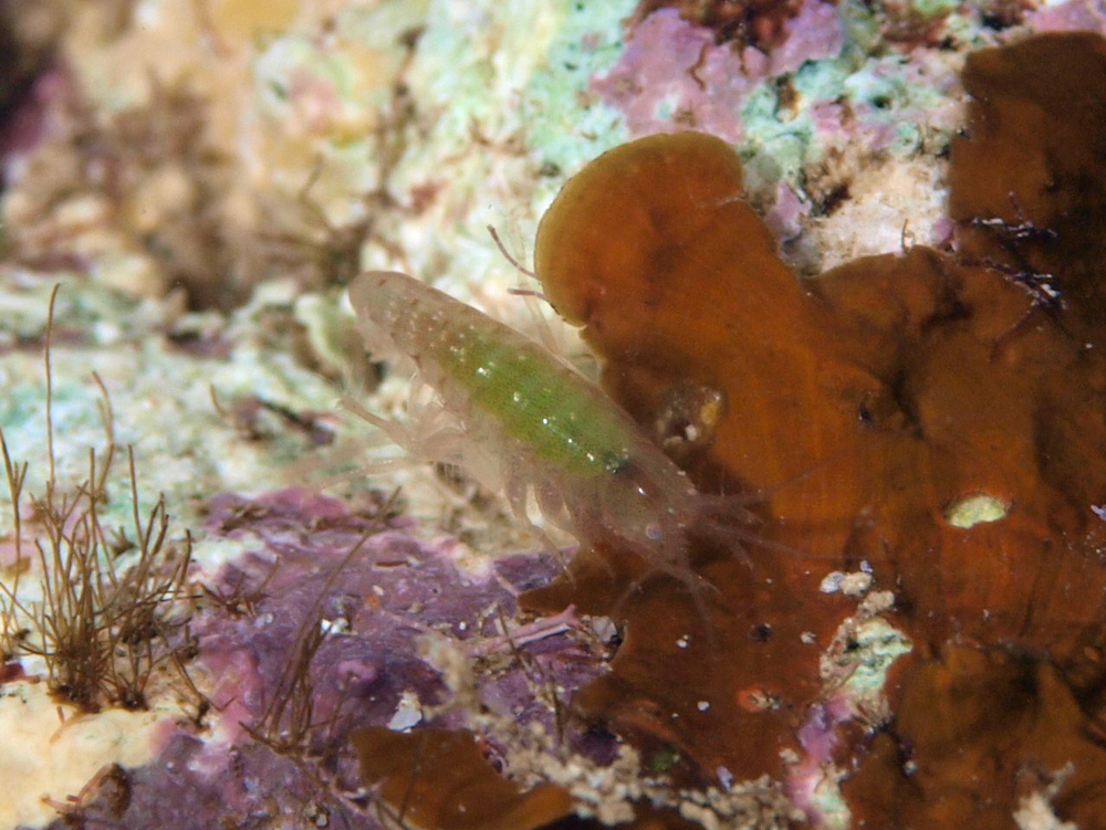 撮影 2009/03/30 沖縄県 石垣島 掲載 2013/08/30 ⇒甲殻類(その他)の仲間 ミルキーな半透明の体に緑色の内臓。 この個体は6〜7oくらいでした。こういう生き物としては大きい方かも。でも小サイズの種類と同様、どこの誰やらボクにはさっぱり分かりません。