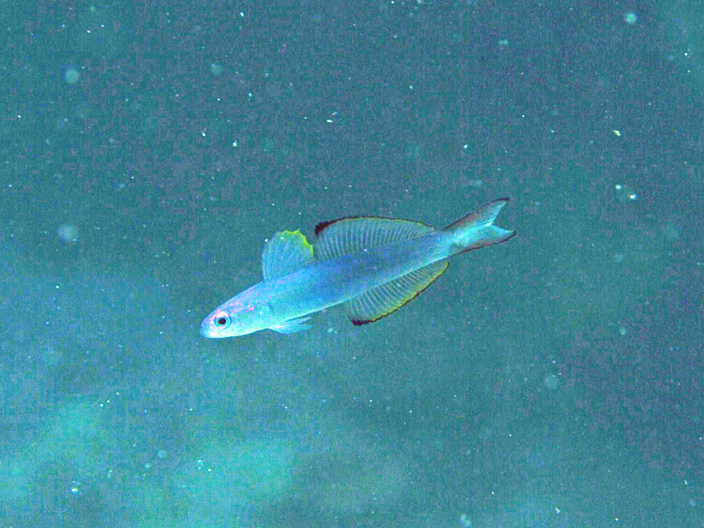 撮影 2008/09/06 沖縄県 鳩間島 掲載 2013/04/02 ⇒クロユリハゼの仲間 まだ下半身が黒くなっていない若魚。 プランクトンか何か浮遊物がいっぱいでちゃんとした色が出ていませんが、鰭が素敵なので掲載しました。