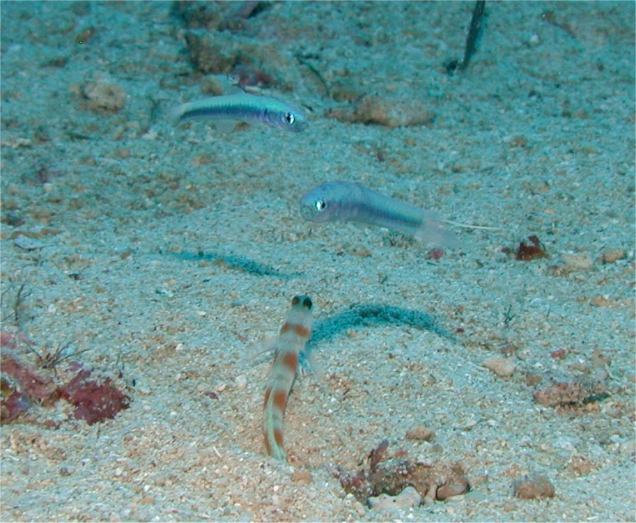 背中を見せているハゼは多分ヤノダテハゼで、ハナハゼの仲間はヤノダテハゼと共生エビの住まいに強引に居候しています。