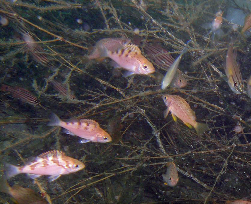 ごちゃごちゃと魚がいますが、左下がウスメバル、その右上がトゴットメバル、その右上も同じ柄でトゴットメバル。その右下の向こうを向いているのがメバルの幼魚です。メバルのオンパレードですね(テンジクダイもいるけど)。