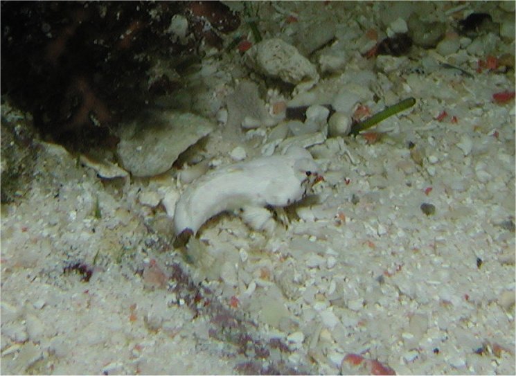 成魚とはまるっきり違って、口元と尾以外は真っ白な幼魚。全長2cmほどで、チョロチョロっと動いてはピタッと止まり、しばらくしてまたチョロチョロっと動いていました。