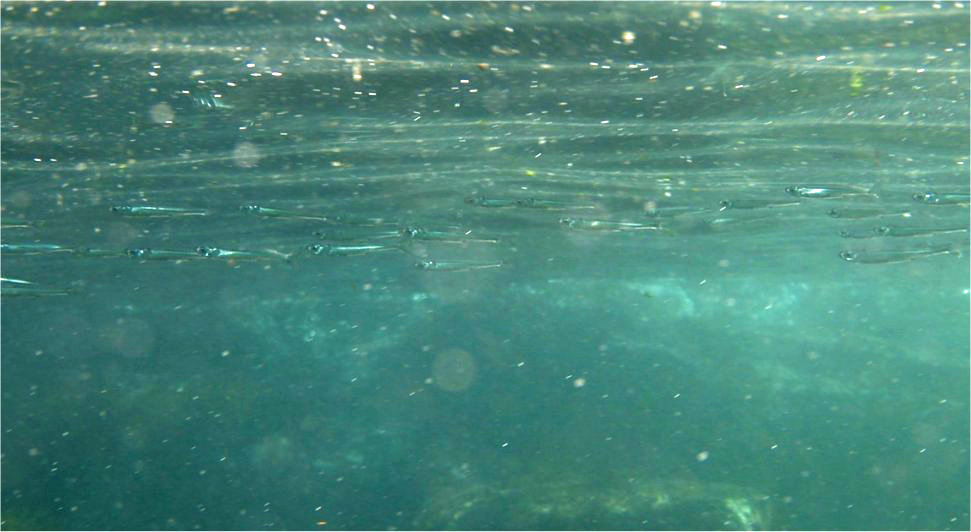 表層付近で群れているこの手の魚は小さいし、近寄れないしで自分の目では種類が何なのかさっぱり分かりません。10年以上当地で営業している経験豊富なガイドが「カタクチイワシの子供です」というので、それをそのまま受け入れることにしました。