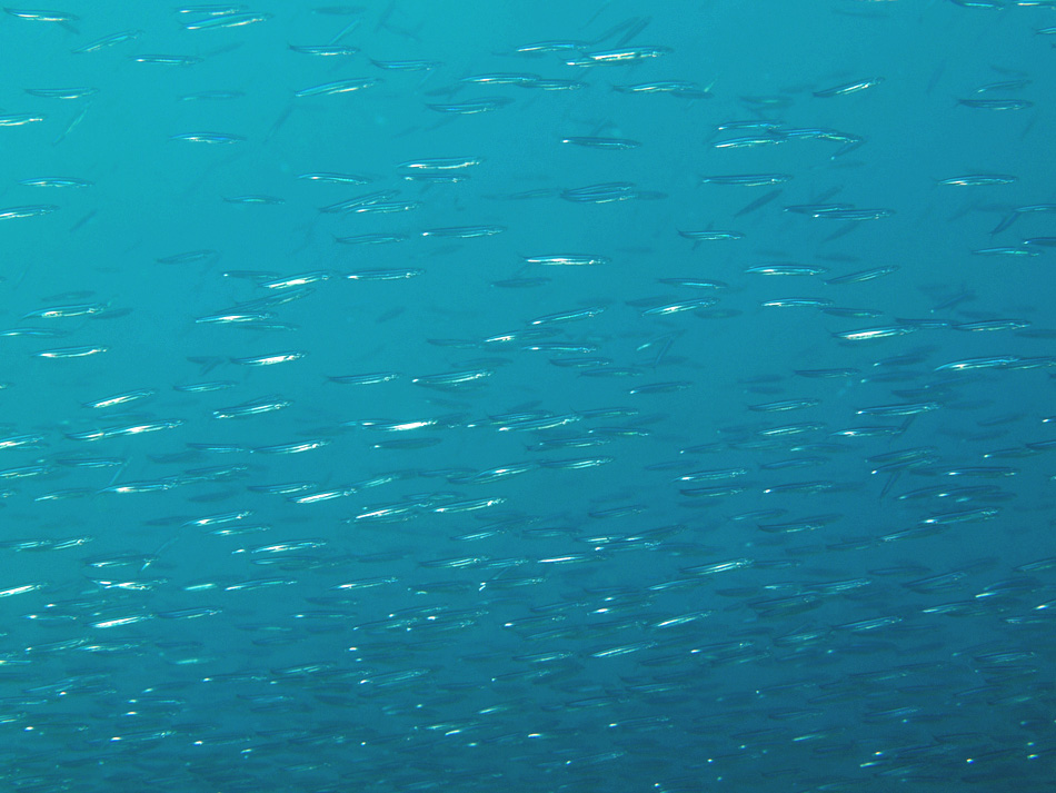 ポイントの近くで手漕ぎの小さなボートが10艘ほど集まって何か漁をしていたので、何をしているのかガイドに尋ねたら、「キビナゴ獲りです」と返答がありました。実際、安全停止していたら写真のようにキビナゴの塊がいくつも右往左往しながら通り過ぎていきました。
