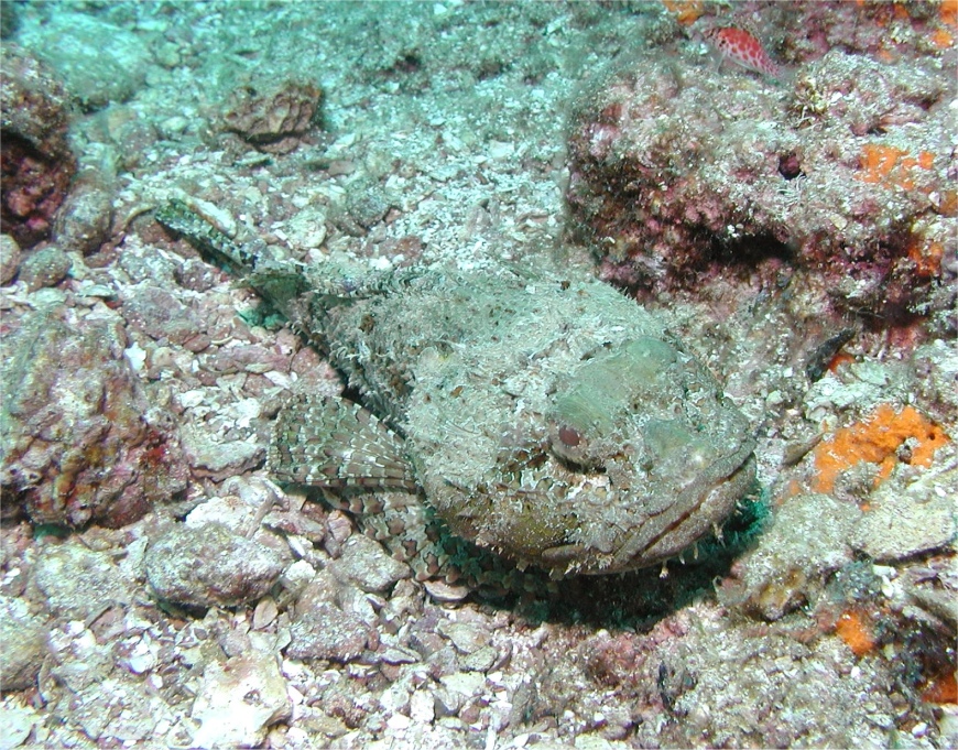 「オニダルマオコゼかなー」と思うのですが、ラパスで見る魚は東太平洋固有種が多い上に、手持ちの2冊のラパス近辺の図鑑にはオニオコゼ科の魚がひとつも紹介されていないので、本当にオニダルマオコゼなのか、または東太平洋固有種なのかを確認することができません。