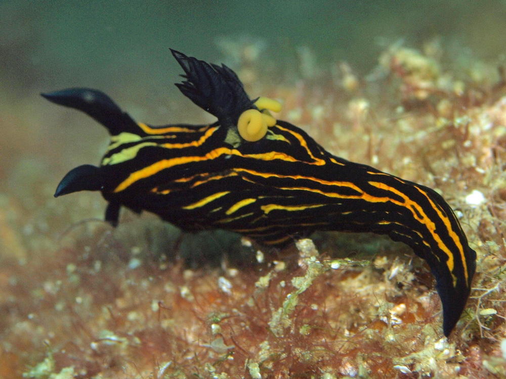 といってもその姿は見えません。黄色いとぐろ状の物が後鰓の側についていますが、これはバナナウミウシヤドリの卵で、自分はその下のウミウシの体内に潜っています。