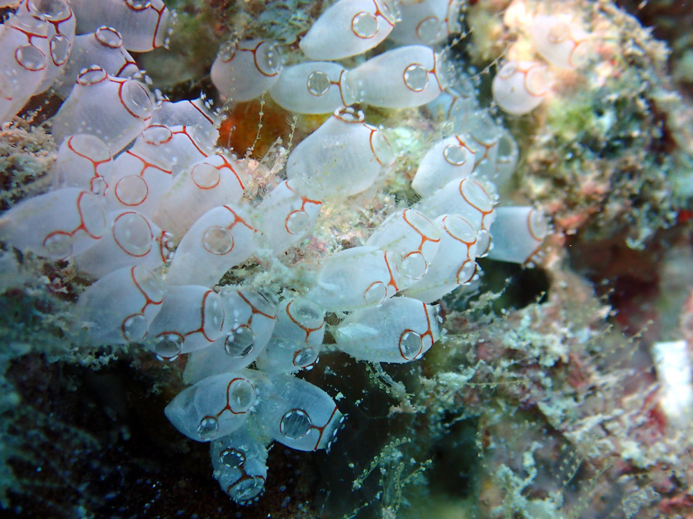 ネットで探したところ、レンベで撮影した写真におなじ模様のホヤがありました。同種の写真はありましたが種名は分からないままです。みんなで大きく口を開けて合唱していますが、オレンジ色の鉢巻きと口紅がなかなか可愛らしくて目を引きます。