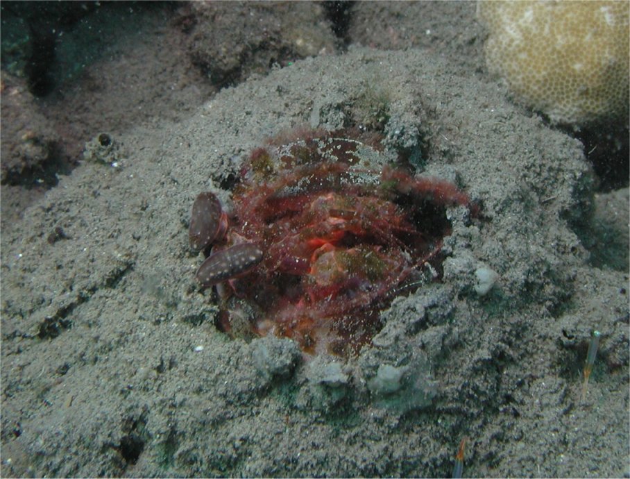 『Crustacea Guide of the World』(IKAN)によると、「トラフシャコと非常に近縁だが、こちらは写真を撮る人間を嫌がらない」のだそうです。ではトラフシャコの方は嫌がるのかと思ってそちらの解説を読みましたが、特に触れてはいませんでした。嫌がるも嫌がらないも、ただ巣穴にすっぽりはまって動きが取れないだけじゃあないのかなー?