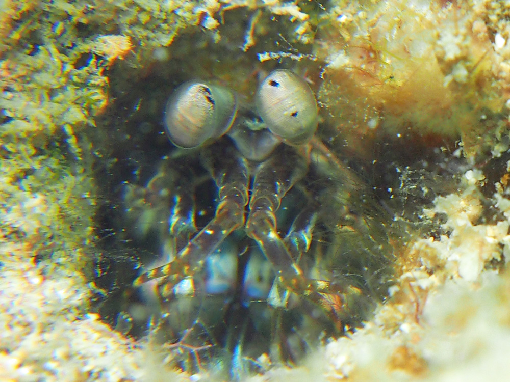撮影 2013/01/09 沖縄県 沖縄島 掲載 2016/05/13 ⇒シャコの仲間 透明感の強い眼や触角ですが、実はガラス製の置物なんです。時々眼があっちを向いたりこっちを向いたりしますが、それは精巧な電気仕掛けなんです。と言いたくなるようなギゴチナイ動き方をしていました。