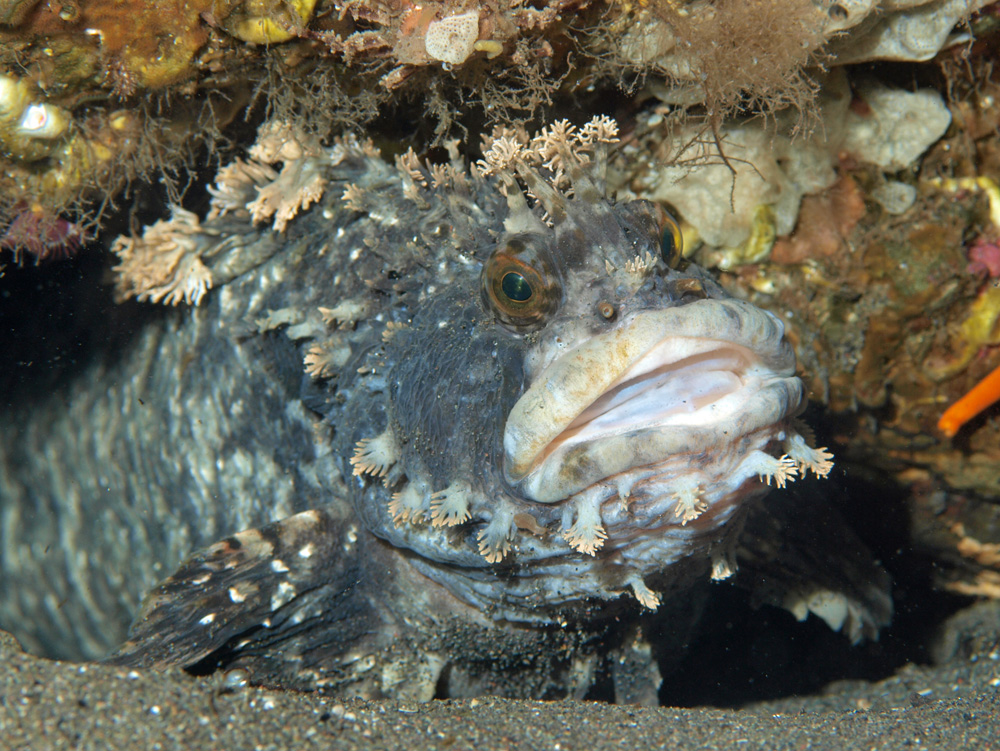 この顔つきと体つきなので、水中で見ると巨大な怪獣のようです。(ちょっと大げさかな?) 『北海道の全魚類図鑑』 尼岡邦夫/仲谷一宏/矢部衛 (2011年初版 北海道新聞社)では最大体長50pとしています。水中では1.3倍に見えるから、近くにいたらちょっと怖いかも。