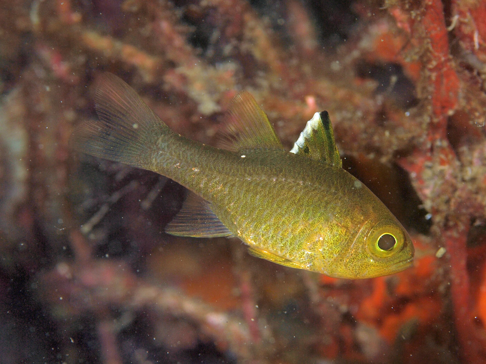 ミヤコイシモチとよく似ているので悩みましたが、ウェブのFish BaseサイトのApogon hoeveniiの記述「第一背鰭の前部が黒っぽくて後端が白くなっている」点が一致しているのでApogon hoeveniiとしました。試みにウェブで“ミヤコイシモチ”で検索してヒットした画像を見ると、本当のミヤコイシモチとApogon hoeveniiが混同されて入り混じっているように思えます。