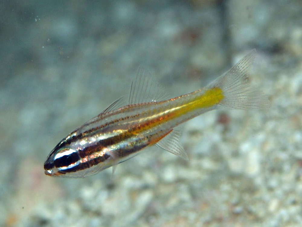 目視で全長2pほどの幼魚が撮れたので追加掲載しました。かなりしっかりした縦縞が体表に出てきています。
