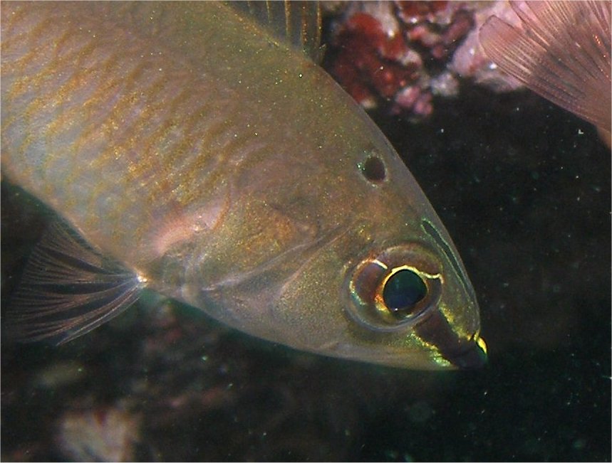 前回のこの種類の掲載時に「もともと地味な魚が多いテンジクダイの中でも、更に一層地味めですが…」と書いたのですが、いやいやどうして、2年後に同じポイントでアップで撮ってみたらまったくの誤解でした。