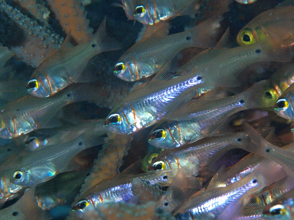 黒帯は見えませんが、口元、鰓のあたりの2本の黄色い線、尾部の黒点からクロオビアトヒキテンジクダイに間違いなしとしました。