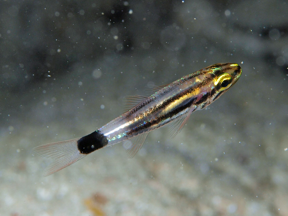 全長は3cmと言ったところでした。浮遊物に邪魔されて画面がにごっているのが残念ですが、体長に比べて大きな眼が幼魚らしさを強調しています。カワイイー!