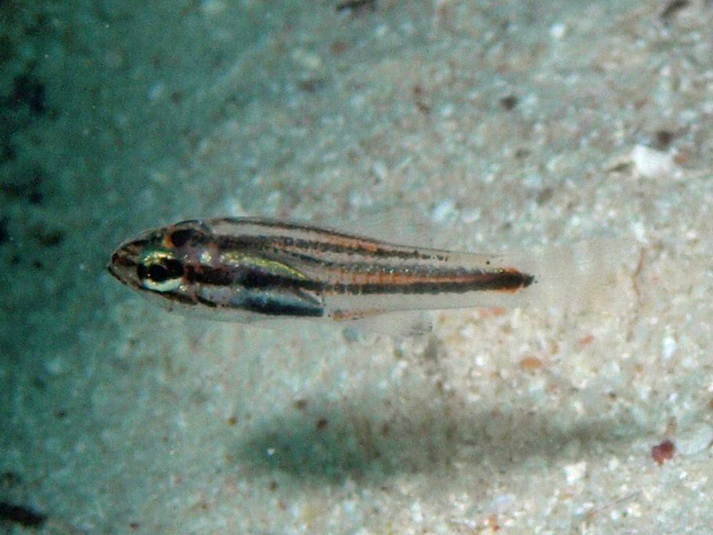 幼魚が撮れたので追加しました。体が半透明で、縦縞は輪郭がくっきりしておらず筆で書いたようです。