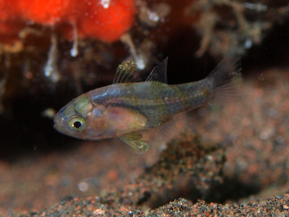 撮影 2009/10/03 インドネシア バリ島 掲載 2014/09/19 ⇒テンジクダイの仲間 一匹だけでひっそりと岩のくぼみに隠れていました。半透明の体に薄緑色の不明瞭な帯が3本入り、尾部に同色の不明瞭な円紋があります。 いろいろ調べましたが全く分からずに同定作業を投げ出しました。幼魚なのかなあ・・・。