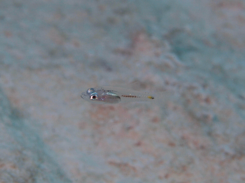 稚魚の写真が撮れたので追加しました。体は透明に近くて、背骨と浮袋が透けて見えています。いずれ黒色の縦縞になるであろう黒い点線もかすかに見えています。尾ひれ付け根の黄色に縁取られた黒斑は体模様の中で一番はっきり見えますが、それでもまだまだ発展途上といったところです。