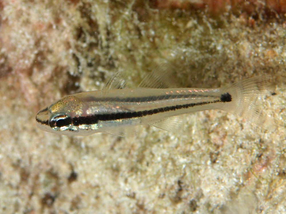 撮影 2008/09/04 沖縄県 西表島 掲載 2013/03/21 ⇒テンジクダイの仲間 幼魚です。縦帯や尾ヒレ付け根の黒斑の位置は成魚と変わりませんが、全体が寸詰まりで頭でっかなところは幼魚ならではです。