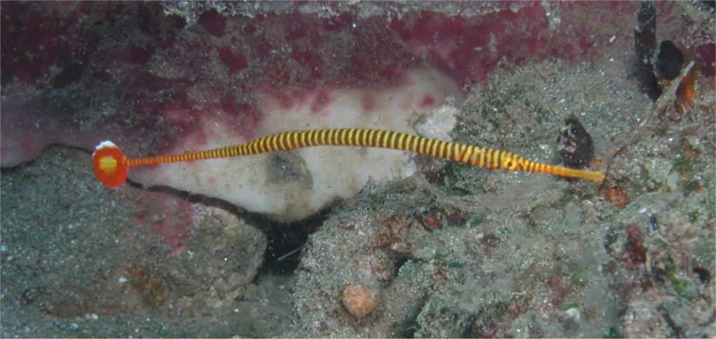 Yellowbanded Pipefishという英名のとおり何十も輪状に縞が入って、それだけでも見ごたえがあるのに、更に尾部がまた言いようもなく美しい。