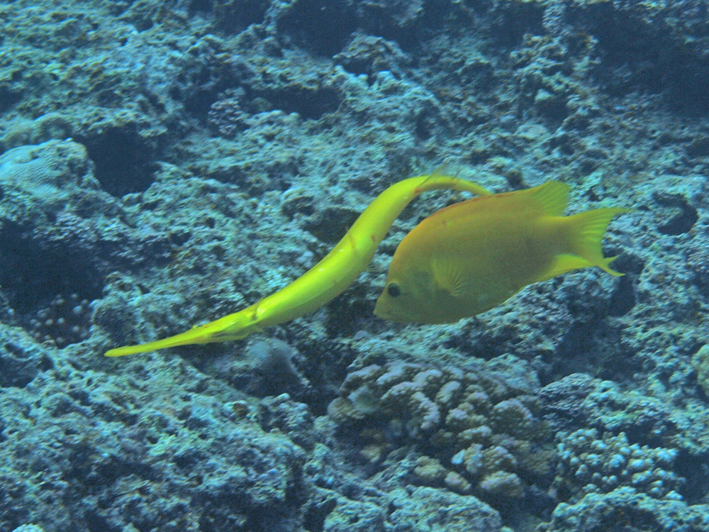 時々見かけますが、全然違う種類の魚にまとわりついていつまでも離れないうっとおしいシーンです。今回はギチベラに付きまとうヘラヤガラ。どちらも黄色なのでとても目立ちました。
