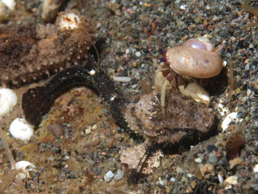 ツマベニホンヤドカリの幼体に頭を踏んづけられても反撃しないでジーッとおとなしく耐えている姿がいじらしく愛おしい。