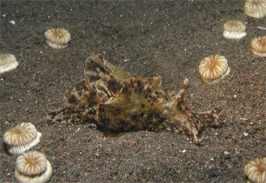 典型的なアメフラシの姿かたちですが、体の模様はいくら調べても該当する種類がありません。アメフラシかアマクサアメフラシのバリエーションかとも思うのですが、決定打はなくて結局種不明に。トホホ。