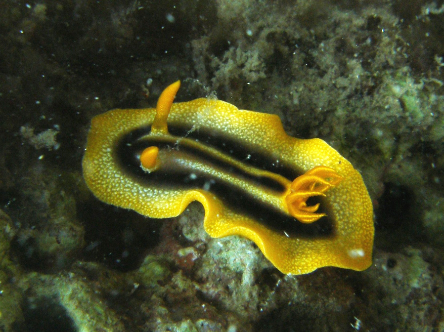 国内には生息しませんが、ダイバーの間では通称があって黄色と黒の縦縞から連想したハンシンウミウシとかタイガースウミウシと呼ばれているそうです。さもありなん。