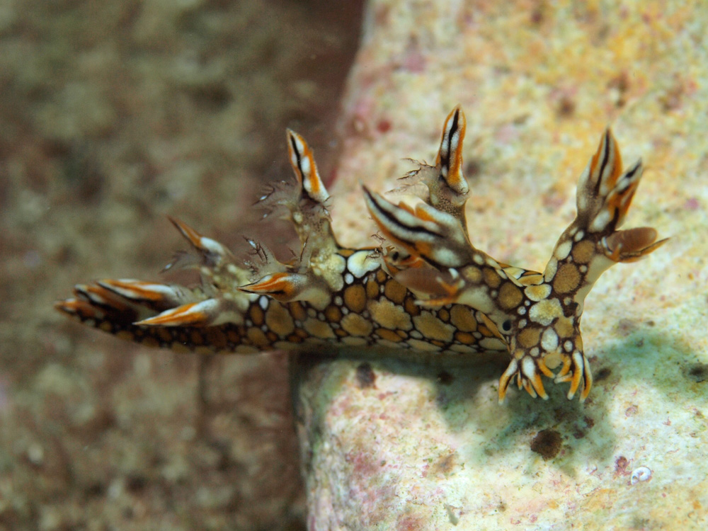 豪華絢爛な柄模様と言うべきか、妖しく不気味な柄模様と言うべきかちょっと迷いますが、ウミウシ好きとしては前者を採るべきなんでしょうね。複雑で凝った柄と色が印象深く、他のどのウミウシとも似ていない個性派に出会うことができてハッピーです。