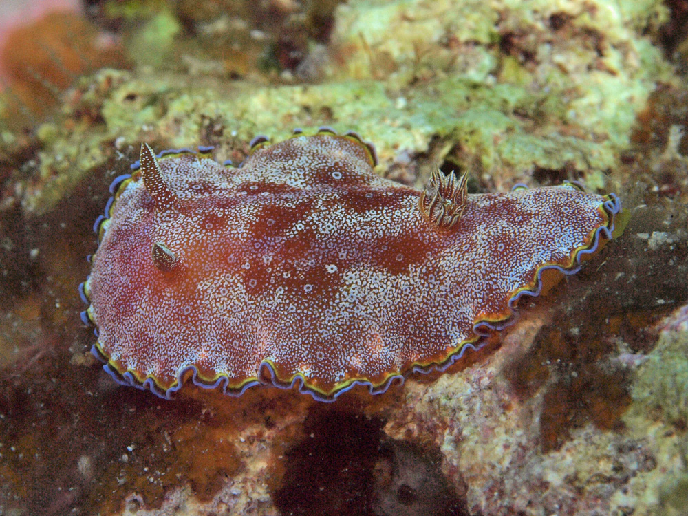 チリメンウミウシだとばかり思いながら撮ったら後でガイドに訂正されました。確かに外套膜の縁が青、紫、黄色と凝った彩になっていてぜんぜん違います。ボクにとっては初見でした。(つまりウレシイ。)今更ですが、ガイドってスゴイなあ。(実際のところはガイドもイロイロだけど。)