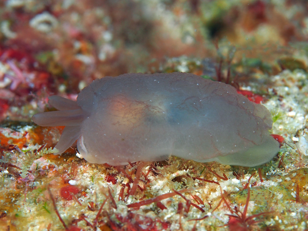 撮影 2013/01/31 沖縄県 沖縄島 掲載 2016/05/31 ⇒ウミウシの仲間 側鰓目 白っぽいタイプの個体が撮れたので追加しました。ほんの少し小豆色が混ざっているようです。アズキ風味ゼリーかあ、意外とおいしいかも。