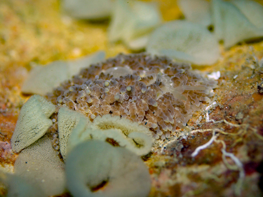 見慣れたウミウシの体型からはかけ離れていますが、これでもれっきとしたウミウシです。ピントが甘くて分かりにくいのですが右側に触覚が写っています。周辺にあるのは卵塊。