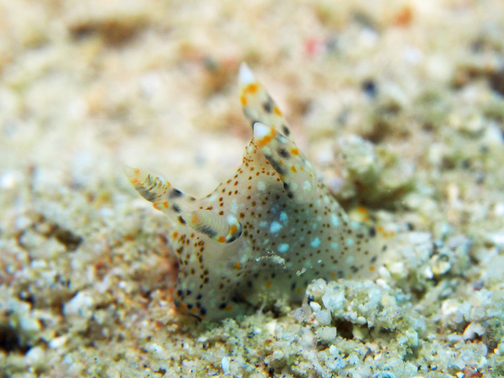 当初は別種かもしれないと疑いましたが、『沖縄のウミウシ−沖縄島から八重山諸島まで−』 小野篤司 (2004年初版 ラトルズ)に「沖縄型」としてボクの写真と同タイプのものが掲載されているのに気づきました。ということで一件落着。(しかし、触角の模様まで違うのは同種にしては違いすぎると思うのですが・・・)