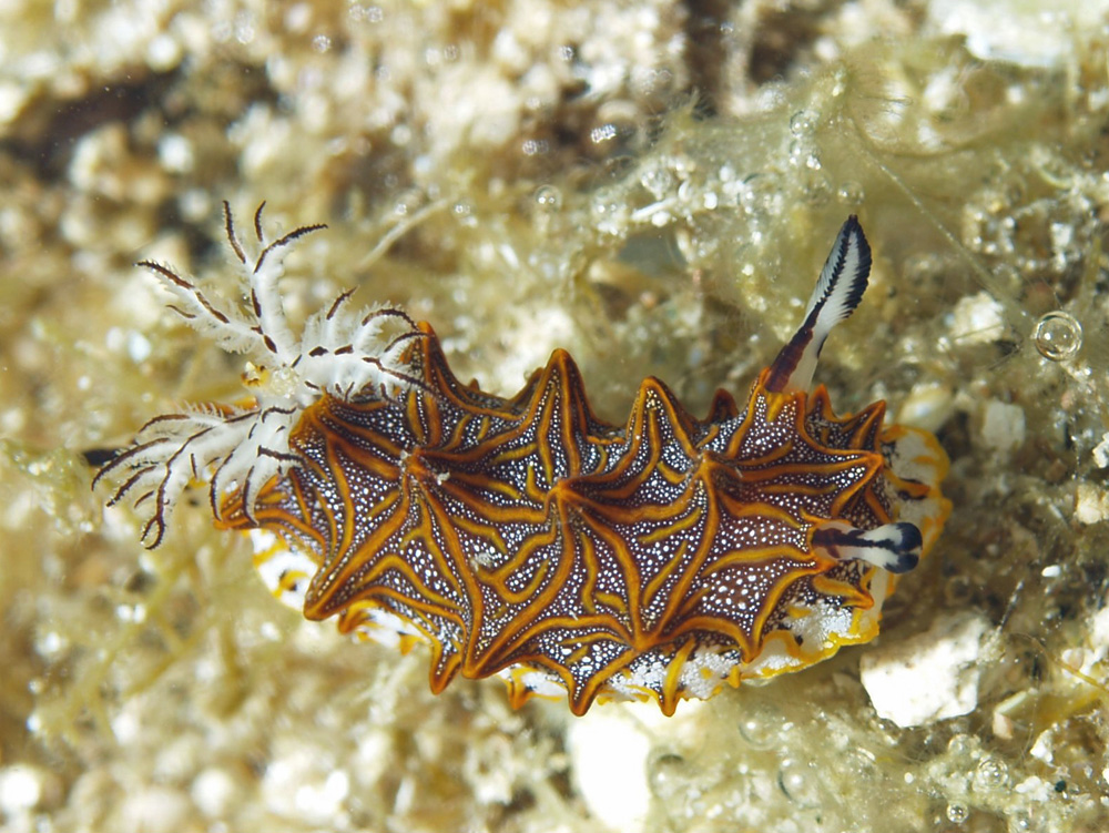 ある本に「動物の多種多様な形はそれぞれ理由があって、長い年月の間に適応と洗練を重ねた結果である」と書いてありましたが、いったいどういう理由と必然性があってこのような幾何学模様を描くに至ったのか見当もつきません。ウミウシの模様は曲線が多い中で特異な個性を主張しているようです。