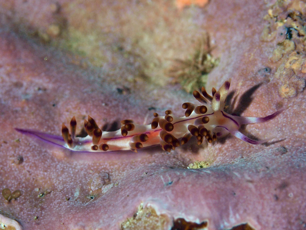 幼体の方は同定に苦労しましたが、こちらの成体は同定のキーとなる背面の正中線上の赤い線が頭部に見えていて、迷いようのない分かりやすいセスジミノウミウシでした。