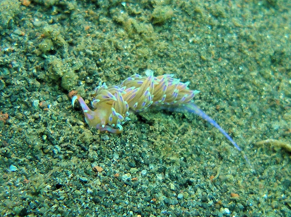 なにはともあれ、長く延びたすみれ色の尾が薄く透けて向こう側の砂が微かに見えているところが繊細さを感じさせてなかなか趣があるなー。ウミウシに雄雌はないけれど、この姿はたおやかな女性の風情です。