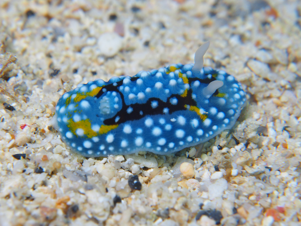 撮影 2013/01/07 沖縄県 沖縄島 掲載 2016/03/10 ⇒ウミウシの仲間 裸鰓目 ドーリス下目 同じ水色でもずいぶん深みのある水色の個体が撮れたので追加しました。ボクはメリハリのあるこちらの方が好みです。