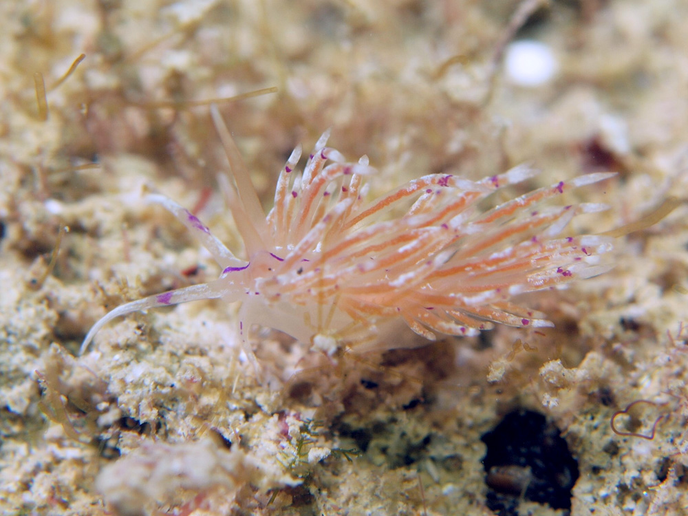 ワオー、チャーミングなウミウシさんです。濃青というか青紫というか微妙ですが、とにかくきれいな色が背中の中央に一本通っているのと触角や背側突起にチラホラ散らばっています。これまでに他のウミウシのページでも散々書きましたが、どういう理由があってこのようなデザインにしたのか知りたいものです。