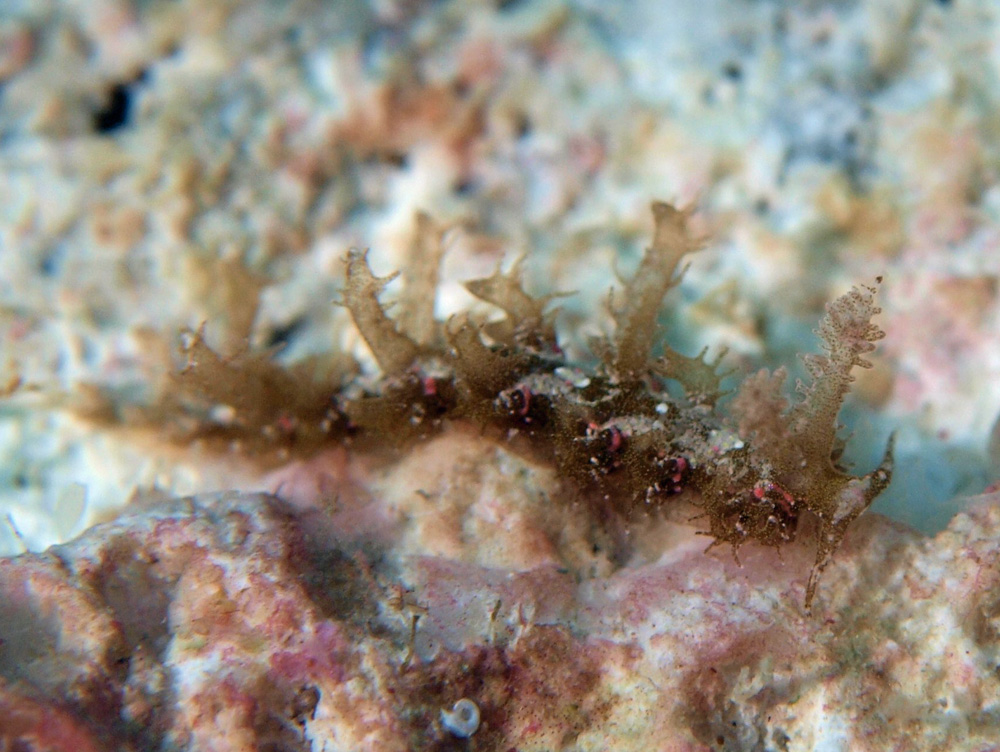 『ベータ版 日本のウミウシ 』 中野理枝 2013年 Version 1.0に掲載の写真は体色が緑で、ボクの写真とは受ける印象がだいぶ違いますが、解説によると「体地色は緑、褐色、黄緑色を帯びた白色などさまざま」とあって、この写真の色でもトゲミノウミウシの範疇に入ります。