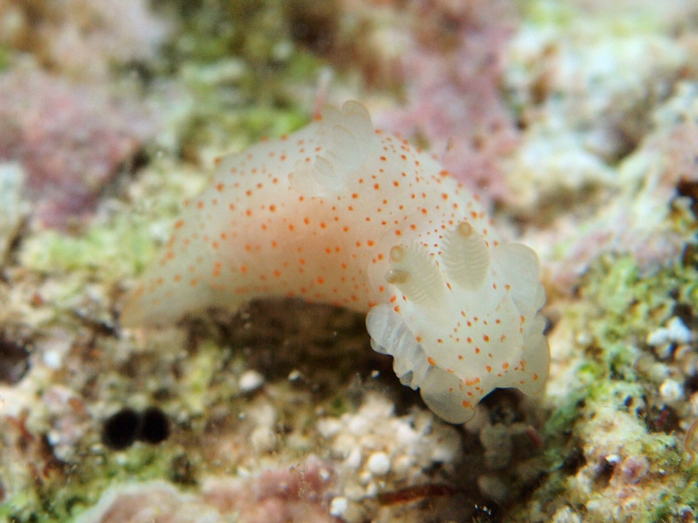 頭部の側面にエラが張ったような、ヒダ状の突起があるのが特徴です。こういう分かりやすい特徴を持っているウミウシは大好きです。反対に、特徴がなくて分かりにくいウミウシは・・・やっぱり大好きです。