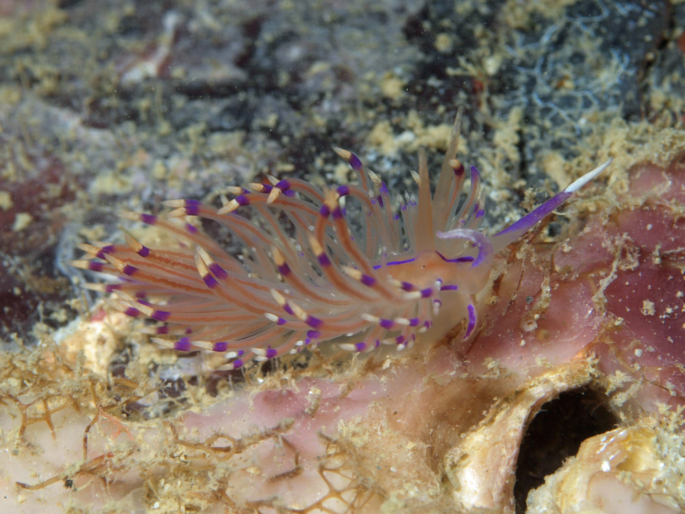 ウミウシに詳しいガイドの話ではレッドビーチだけで見るそうです。Sakuraeolis kirembosa に似ていますが、この被写体が背面中央に濃い菫色の縦線が通るのに対して、あちらは無地です。