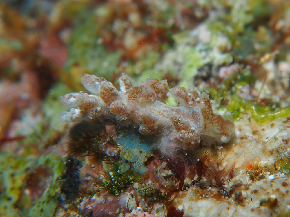撮影 2013/01/31 沖縄県 沖縄島 掲載 2016/06/08 ⇒ウミウシの仲間 裸鰓目 ドーリス下目以外 薄〜いコーヒー色です。ボクは日ごろ一般的な量の1/3しか豆を使わない、極端に薄いコーヒーをガブガブ飲んでいるので、このウミウシさんにはとても親しみを感じます。 言葉が通じるなら友達になってコーヒー談義をしたいところだけど無理だしなあ・・・残念です。