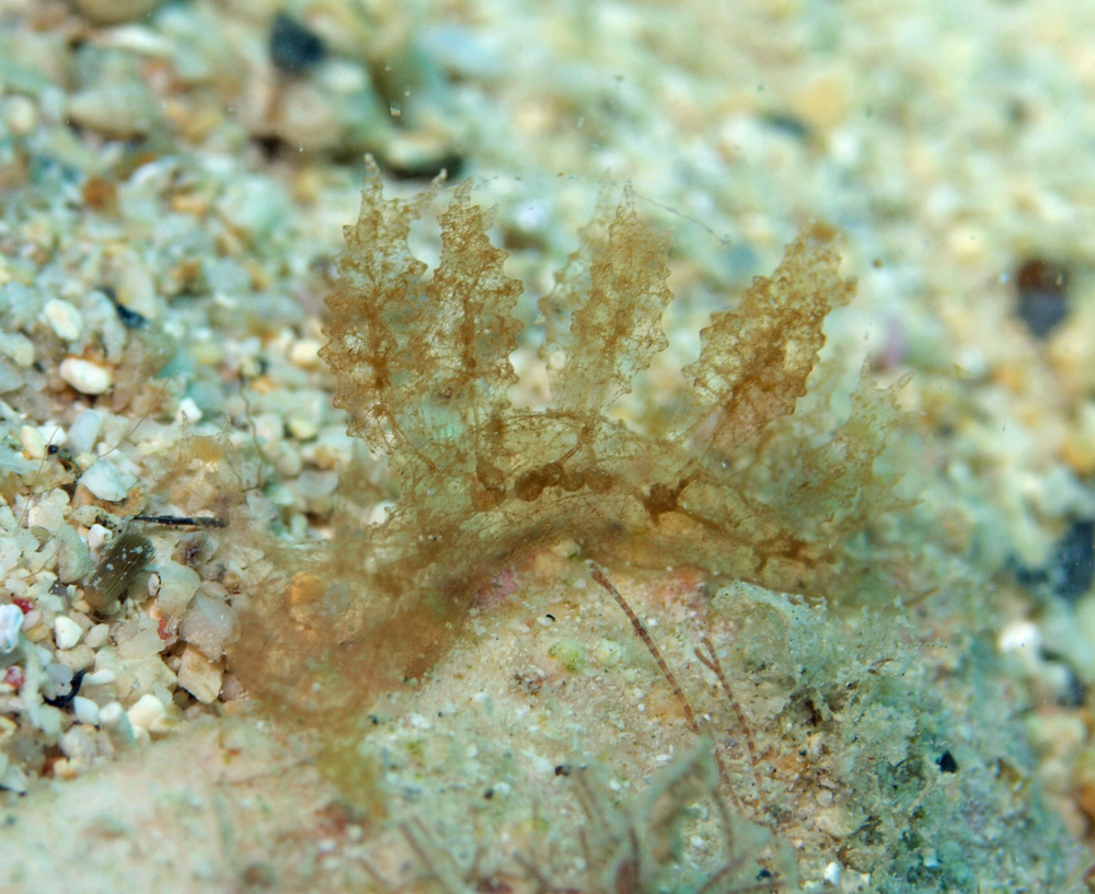 背側突起の形状や体が透き通っていて内臓が見えていている点はマツゲメリベウミウシに似ていますが、特色である小さな白色点が見られないので別の種だろうと判断しました。そうはいっても、共通点の多さからするとマツゲメリベウミウシのバリエーションの可能性はありそうです。
