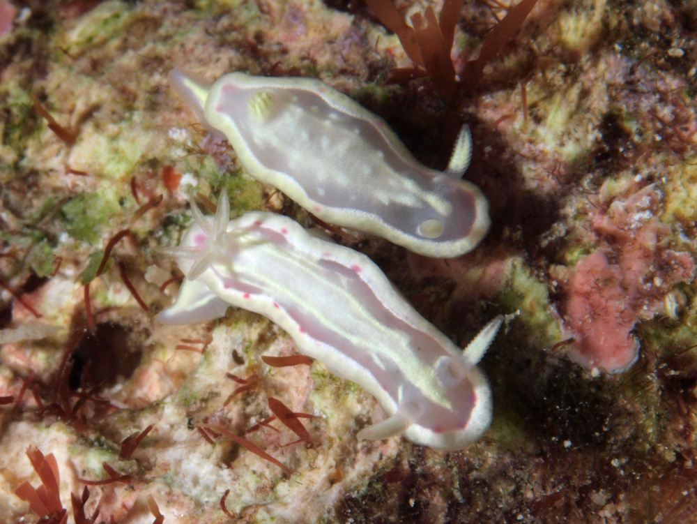 撮影 2011/09/25 沖縄県 沖縄島 掲載 2015/06/14 ⇒ウミウシの仲間 裸鰓目 ドーリス下目 和名通りの淡くて薄い体色です。周縁の白色帯にほんのりピンク色の水玉があしらわれているところが可愛らしい。 2個体いますが繁殖行動は見られませんでした。