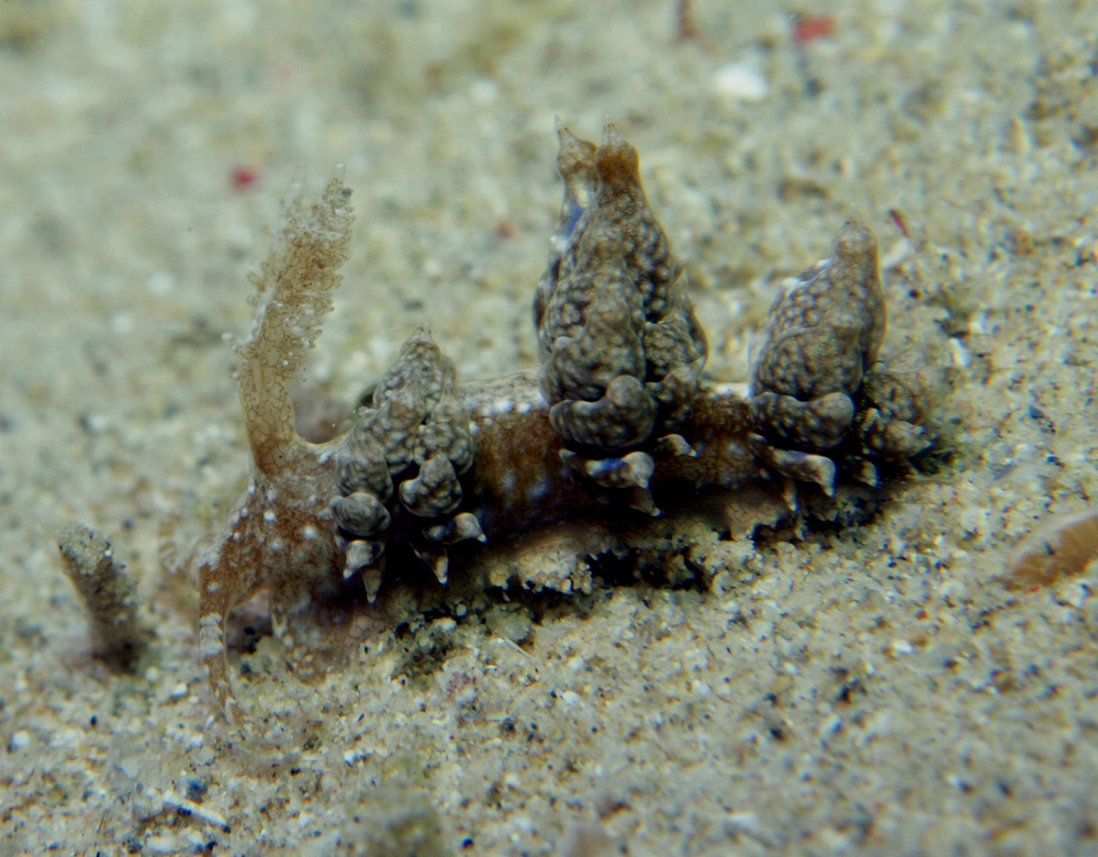 つたない表現ですが、ずいぶん長い触角で、半分から上の方はトゲトゲが出ています。それがこのウミウシの特徴の一つです。背側突起の先端はかわいく膨らんだ先が尖っていて、それも特徴の一つです。所々に青い斑紋があるのも特徴の一つです。以上、3つの特徴が揃っていてボクでも簡単に種類が分かりました。素人故に同定に苦労することが多いので、こういう個体は大歓迎です。