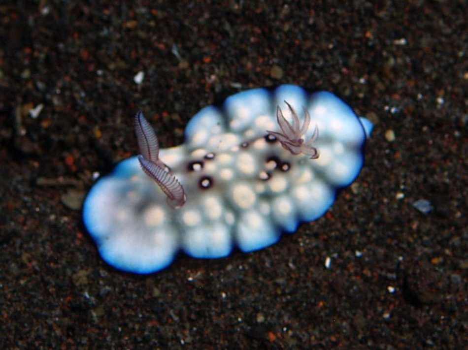触角と後鰓以外はピントが合っていないように見えますが、そうではなくて、このウミウシの模様自体がぼんやりしているのでこれでピントぴったりなんです。妙なウミウシですね。